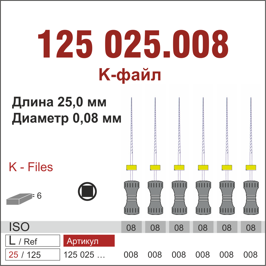 125025.008-инстр. для эндодонтии К-файл ,6 шт., ДИАСВИСС СА ,Швейцария